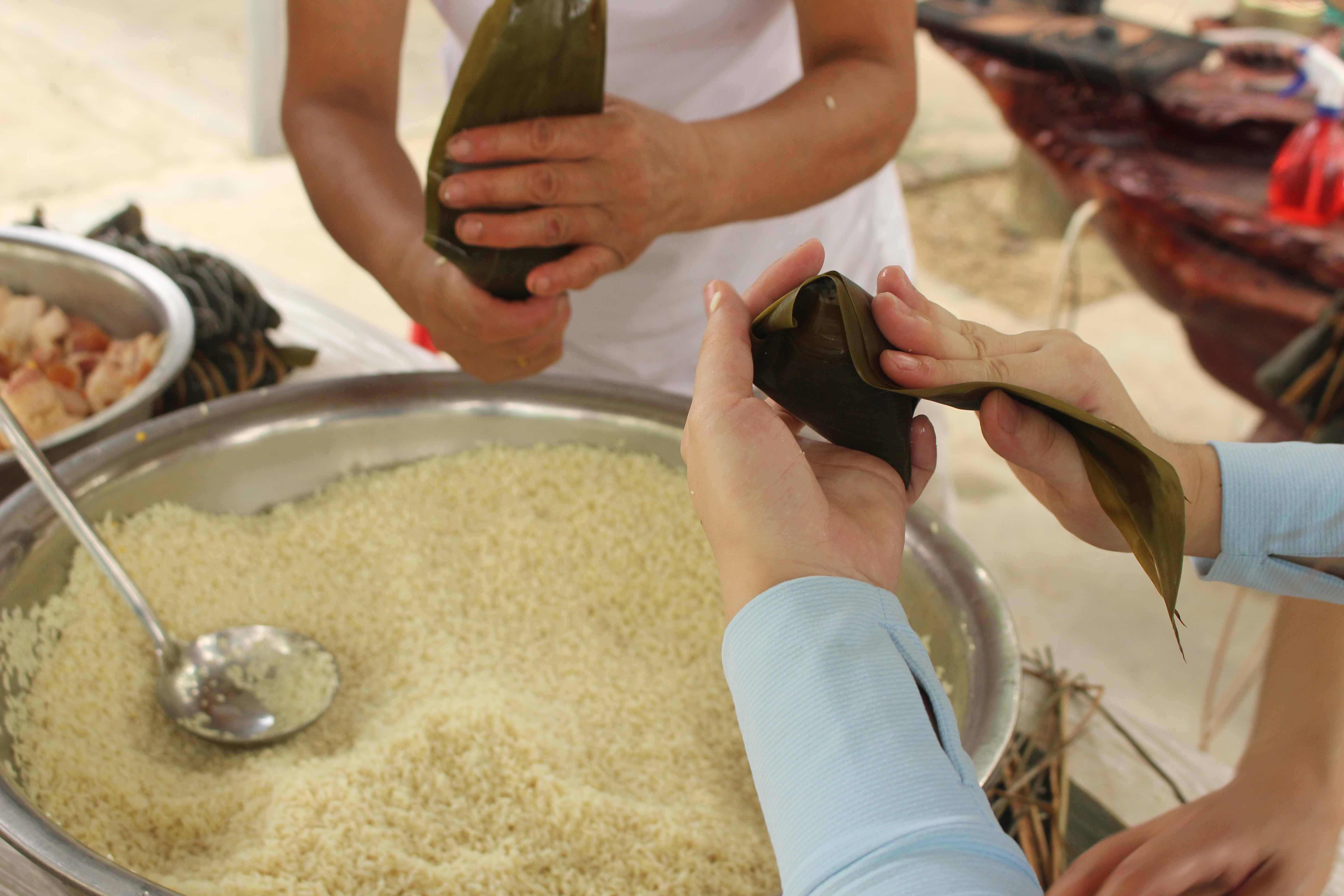 等材料?;顒蝇F(xiàn)場,由包粽子經(jīng)驗豐富的員工親手示范教學(xué),大家