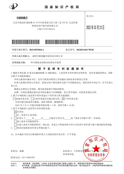 公司申報的發(fā)明專利“一種含鎳廢水的廢水處理技術(shù)裝置”技術(shù),獲得國家專利局正式授權(quán),可喜可賀!