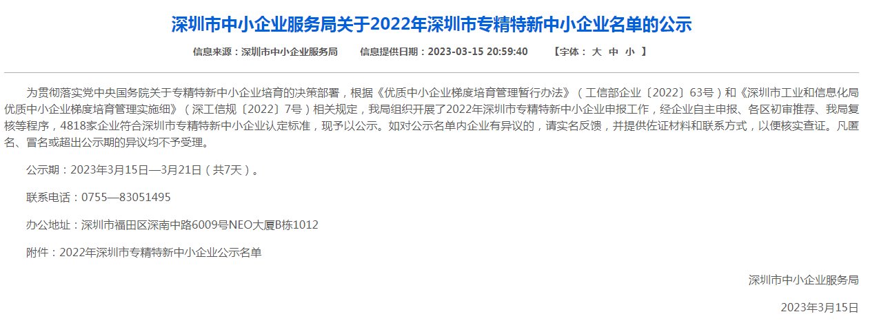 重大喜訊!我公司被評(píng)為深圳市2022年度“專精特新”中小企業(yè)
